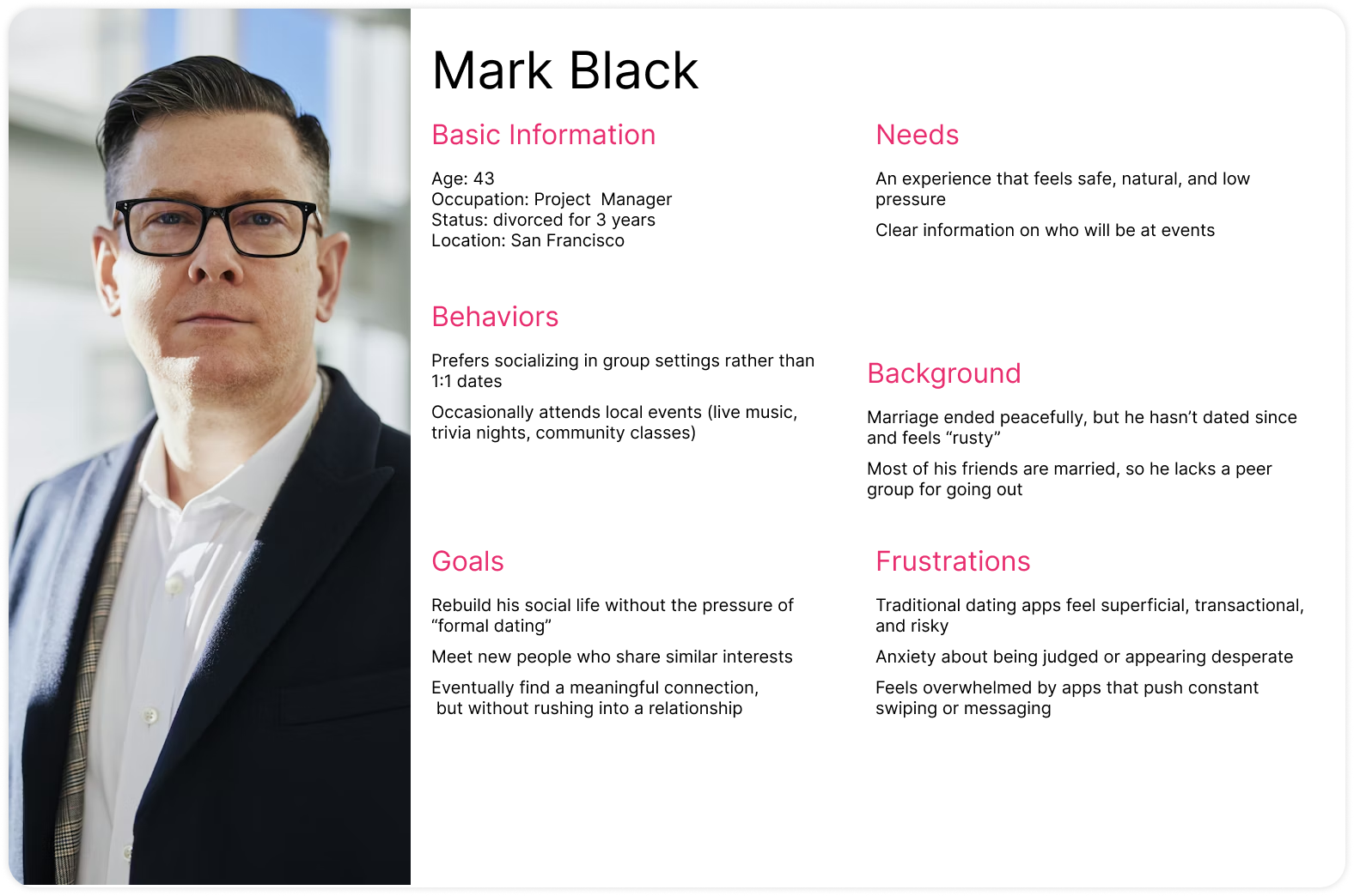 To better understand user behavior I developed two key personas to guide the design of the dating app experience. These personas help ensure the app addresses the needs, motivations, and frustrations of different user groups.